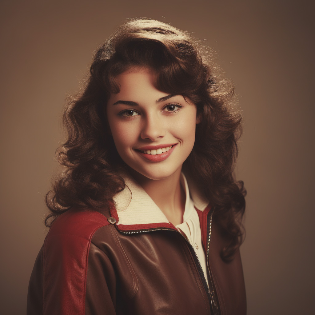 /imagine realistic photo retro filter in color of smiling girl teen with curly brown hair, bangs and red lips in college jacket in 1950s high schoolFrån fotografering till fotoredigering